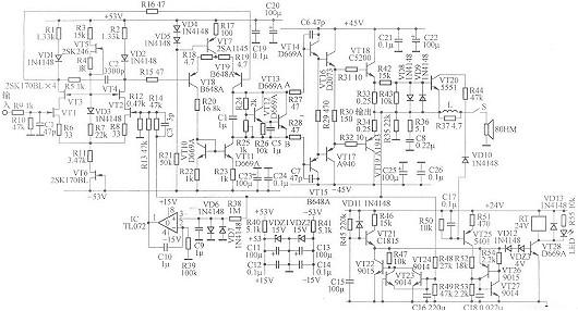 V4、VR和R9接在V3、V5集電極之間構(gòu)成Vbe擴(kuò)大電,調(diào)節(jié)VR可改變末級(jí)大功率管的靜態(tài)工作電流。V4還起度補(bǔ)償作用,當(dāng)功率管的溫度升高時(shí),V4的發(fā)射結(jié)壓降小,于是V4的集電極一發(fā)射極電壓也降低,從而降低了功管的靜態(tài)電流,作用與二極管相似,但比二極管更靈,安裝時(shí)應(yīng)與功率管一起裝在散熱器上,電氣上要絕。