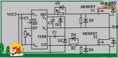 如圖二所示,典型應(yīng)用電路是由驅(qū)動2個N溝道MOSFET管或IGBT組成的半橋驅(qū)動電路。固定的柵極參考輸出通道(L0)用于下端連接的功率場效應(yīng)管T2,浮動的柵極輸出通道(HO)用于上端連接的功率場效應(yīng)管T1。以驅(qū)動N溝道MOSFET管為例來介紹。功率MOS—FET是電壓型驅(qū)動器件,沒有少數(shù)載流子的存儲效應(yīng),輸入阻抗高,因而開關(guān)速度可以很高,驅(qū)動功率小,電路簡單。但功率MOSFET的極間電容較大,其等效電路圖一所示。