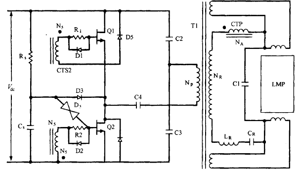 在導(dǎo)通霎時(shí)就是由于較低的尺而招致了電流沖擊。在燈點(diǎn)亮以 后,燈管的阻抗會(huì)降落 ,Q 增加,R,也增加,從而電流就會(huì)調(diào)整為預(yù)定功率時(shí)的輸出值 。電流變壓器的初級(jí)調(diào)和振電感Lr、諧振電容Cr相串聯(lián),這樣增加了導(dǎo)通阻抗,有利于在開端的時(shí)分降低電流的沖擊。電流變壓器是基極比例驅(qū)動(dòng)變壓器(8.3.5節(jié))。其臣比NA/N,設(shè)計(jì)為最小的晶體管P值。這通常確保了在一切的電流程度下都有足夠的基極驅(qū)動(dòng)。由于極電極和基極的電流比剛好就是變壓器的臣比,這會(huì)保證在高電流輸出下有足夠的基極驅(qū)動(dòng),而在低電流輸出時(shí)則能夠降低基極驅(qū)動(dòng)以減少存儲(chǔ)時(shí)間。剛開端導(dǎo)通時(shí),電路的振蕩頻率是 1/(卻在刃,Ce 是 Cr和Cl的串聯(lián)值,其值為ClCr/(Cl+Cr)。當(dāng)燈管點(diǎn)亮?xí)r,由于Cl與較低的阻抗并聯(lián),所以電路的諧振頻率降為 1/(勿在已。啟動(dòng)電路包括 R 、C,和 DY o D3 的工作相似于16.8節(jié)中的并聯(lián)半橋諧振電路,C4是一個(gè)隔直電容 ??偠灾撾娐泛碗娏黟侂婋娐芬粯硬⒉蝗菀灼饰鲈O(shè)計(jì)。設(shè)計(jì)時(shí)并沒有足夠的把握保證曾經(jīng)思索到了最壞的狀況,也不能保證同終身產(chǎn)線上的產(chǎn)品都是一樣的 。由于啟動(dòng)時(shí)的瞬 態(tài)過程和各個(gè)工作模態(tài)下的等效電路很難肯定 ,并且燈管電流準(zhǔn)確值也不容易計(jì)算出來 。