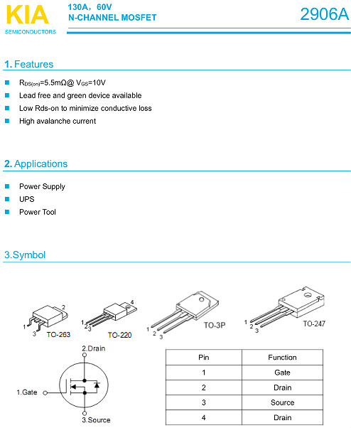 逆變器24V輸入MOS管 2906A 130A/ 60V原廠 規(guī)格書下載-KIA MOS管
