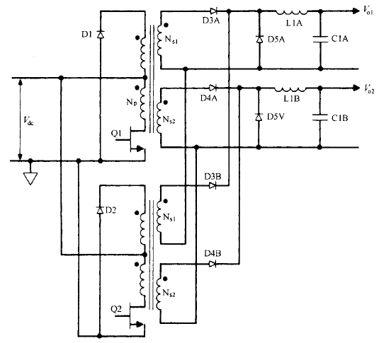 不過至今仍不很肯定 , 在輸入和負(fù)載失常的 瞬態(tài)情況下 ,推挽拓?fù)涞拇磐ú黄胶鈫栴}能否完好能處置 。沒有磁通不平衡問題可能是運(yùn)用交錯正激變換器的最好理由 。 在較少見的直流輸出電壓超越 200V 的場所,同樣的輸出功率下 ,選用交錯正激變換器比選用單個正激變換器更合理 。單個正激變換器輸出續(xù)流二極管( D5A 或 D5B ) 承受的反向 電壓峰值為交錯正激變換器的兩倍 。