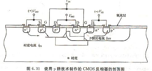 CMOS電路的阱結(jié)構(gòu)最主要的問(wèn)題在于閂鎖現(xiàn)象,閂鎖是由阱結(jié)構(gòu)中寄生的pn—p-n二極管作用所造成的,如圖6.3】所示,寄生的p—n-I,一n二極管是由一橫向的p-n-p及一縱向的n-p-n雙極型晶體管所組成的.p溝道MOSFFT的源極、n襯底及p阱分別為橫向p-n-p雙極型晶體管的發(fā)射極、基極及集電極;n溝道MOSFET的源極、p阱及n襯底分別為縱向n-p-n雙極型晶體管的發(fā)射極、基極及集極其寄生部分的等效電路如圖6.32所示.凡及Rw分別為襯底及阱中的串聯(lián)電阻.每一晶體管的基極是由另一晶體管的集電極所MOS管驅(qū)動(dòng),并形成一正反饋回路,其架構(gòu)就如第5章中所討論的可控硅器件( thyristor).閂鎖發(fā)生于兩個(gè)雙極型晶體管的共射電流增益乘積大于l時(shí).當(dāng)發(fā)生閂鎖時(shí)'一大電流將由電源供應(yīng)處(Vpo)流向接地端,導(dǎo)致一般正常電路工作中斷,甚至?xí)捎诟唠娏魃岬膯?wèn)題.而損壞芯片本身.