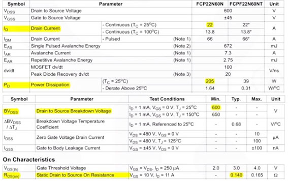 以22N60N這款MOSFET為例,我們查看數(shù)據(jù)手冊(cè),連續(xù)工作模式的相關(guān)參數(shù)如下: