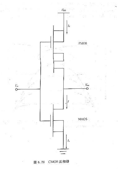 如圖6. 28所示,CMOS反相器為CMOS邏輯電路的基本單元.在CMOS反相器中,p與n溝道晶體管的柵極銜接在一同,并作為此反相器的輸入端,而此二晶體管的漏極也連接在一同,并作為反相器的輸出端.n溝道MOSFET的源極與襯底接點均接地,而p溝道MOSFET的源極與襯底則銜接至電源供應(yīng)端(VDD),需留意的是p溝道與n溝道MOSFET均為增強型晶體管,當(dāng)輸入電壓為低電壓時(即vin=O,VGsn=o