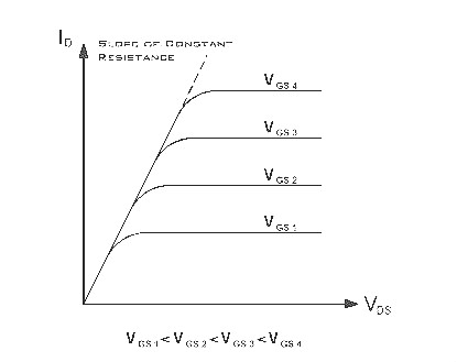 圖MOS管的漏極輸出特性場效應(yīng)晶體管的輸出特性可以劃分為四個區(qū)域:可變電阻區(qū)、截止區(qū)、擊穿區(qū)和恒流區(qū)。 可變電阻區(qū)(UDS