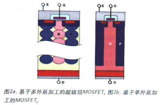 圖2‘給出了早期超級(jí)結(jié)器件的結(jié)構(gòu),傳統(tǒng)上它一直使用多外延工藝制造。豐富的N區(qū)域摻雜說(shuō)明其比傳統(tǒng)平面晶體管有著了更低的電阻.P型區(qū)包圍N溝道的架構(gòu)可以實(shí)現(xiàn)所需的擊穿電壓。