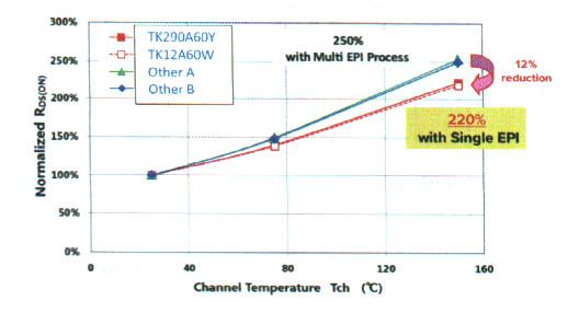 單外延工藝也使超級(jí)結(jié)MOSFET對(duì)溫度變化時(shí)有著更穩(wěn)定的性能,這有助于在更高工作溫度時(shí)維持功率變換器的效率。圖3說(shuō)明了采用最新一代技術(shù)使器件標(biāo)稱(chēng)導(dǎo)通電阻在溫度變化顯著時(shí)減少,在150℃時(shí)導(dǎo)通電阻降低了12%。