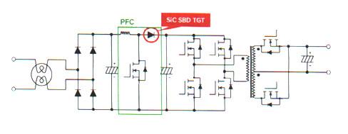 圖5:最新SiC=極管與高速超級(jí)結(jié)MOSFET結(jié)合使用可提高PFC電路的效率。