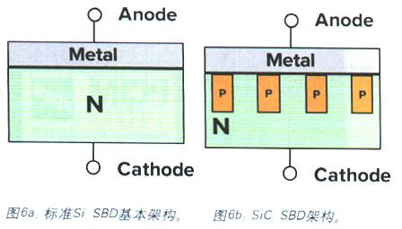 圖6a和6b給出了結(jié)構(gòu)改進(jìn)后的SiC SBD與標(biāo)準(zhǔn)Si SBD的結(jié)構(gòu)對(duì)比。
