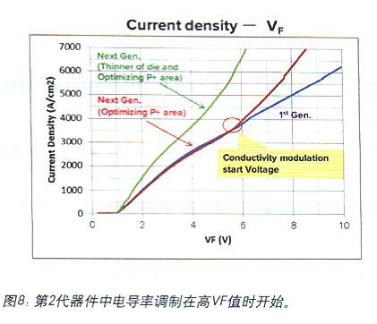 改變二極管結(jié)構(gòu)改善了電流密度和VF之間的關(guān)系,提高了奠電導(dǎo)率調(diào)制開(kāi)始出現(xiàn)的電壓,如8所示圖。這樣使器件有著較高IFSM.也使第2代架構(gòu)的IFSM優(yōu)于第1代器件。