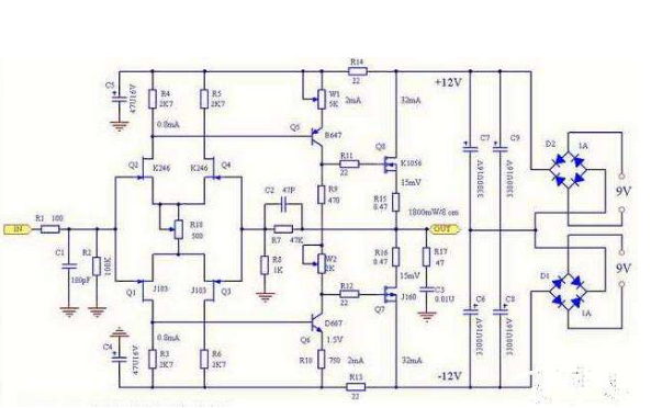 、低噪聲、低失真等特色,已被廣泛地應(yīng)用在音響電路中,用VMOS功率場(chǎng)效應(yīng)管制成的功放,音色美麗,音色比雙極型晶體管功放暖,與電子管功放類似,失真小且制造簡(jiǎn)單,因而很受音響愛好者的喜歡。能具有克己的高品質(zhì)功放更是許多發(fā)燒友的愿望,因?yàn)樽詡€(gè)著手制造功放 既能夠?qū)W習(xí)技能,又能夠依據(jù)自個(gè)的喜愛制出合適自個(gè)品位的功放,實(shí)為一種樂趣和享用。下面介紹一款簡(jiǎn)練易制的場(chǎng)效應(yīng)管功放。 如圖所示(圖中只畫出一個(gè)聲道)。為減小失真,輸入級(jí)選用差動(dòng)放大電路。V1用對(duì)管2SC1583,安穩(wěn)性和對(duì)稱性好;V2接成恒流源,為本級(jí)供給安穩(wěn)的靜態(tài)作業(yè) 電流,選用恒流源作差動(dòng)放大器的射極電阻,可進(jìn)步差動(dòng)放大器的共模按捺比和動(dòng)態(tài)規(guī)模,然后進(jìn)一步改善失真。c1為輸入耦合電容,R1、c2構(gòu)成低通濾波器,阻撓前級(jí)的超音頻攪擾信號(hào)竄入功放;R2決議了功放的輸入阻抗。合方式,是從本錢上思考的。若全用場(chǎng)效應(yīng)管,效果非常好。 各管的射(陰)極都加有本級(jí)電流負(fù)反饋電阻,起安穩(wěn)靜態(tài)作業(yè)點(diǎn)的效果。有利于改善失真。整機(jī)負(fù)反饋則由R18、R19、C6、C7構(gòu)成,總增益約為26.8dB。C7是隔直電容,使前后級(jí)構(gòu)成直流全負(fù)反饋,保證輸出中點(diǎn)靜態(tài)零電位。 c3、c6是為了按捺高頻自激振蕩而設(shè)置。放大器的電壓增益大部分由V3取得,而c3可發(fā)生高頻負(fù)反饋,下降放大器的高頻增益,損壞高頻自激的起伏條件。但c3又使高頻相位 愈加滯后,所以在反饋回路中參加C6,進(jìn)行相位超前補(bǔ)償,損壞高頻自激的相位條件。 C5、R17構(gòu)成相移校正電路,使負(fù)載近于純電阻。避免高頻自激。因?yàn)閾P(yáng)聲器阻抗中的電感重量在高頻時(shí)明顯增加,使放大器的負(fù)載呈電理性,導(dǎo)致輸電流滯后于輸m電 壓。若放大器的高頻增益較高,還簡(jiǎn)單發(fā)生高頻自激振蕩。