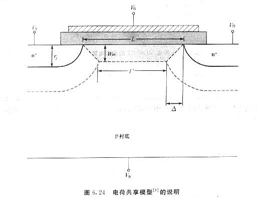 當(dāng)溝道的邊緣效應(yīng)變得不可疏忽時(shí),隨著溝道的縮減,n溝道MOSFET的閾值電壓通常會(huì)變得不像原先那么正,而關(guān)于p溝道MOSFET而言,則不像原先那么負(fù),圖6.23顯現(xiàn)了在VDS=o.05V時(shí)VT下跌的現(xiàn)象.閾值電壓F跌可用如圖6.24所示的電荷共享(chargesharing)模型來(lái)加以解釋,此圖為一個(gè)n溝道MOSFET的剖面圖,且器件工作在線性區(qū)(VDs≤o.1V),因而漏極結(jié)的耗盡區(qū)寬度簡(jiǎn)直與源極結(jié)相同.由于溝道的耗盡區(qū)與源極和漏極的耗盡區(qū)堆疊,由柵極偏壓產(chǎn)生的電場(chǎng)所感應(yīng)生成的電荷可用這梯形區(qū)域來(lái)近似同等.