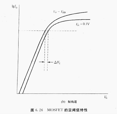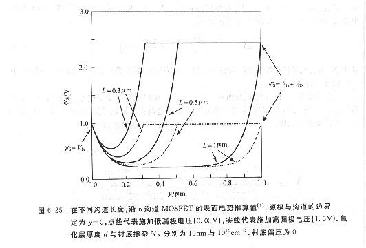 當(dāng)短溝道MOSFET的漏極電壓由線性區(qū)增至飽和區(qū)時(shí),其閾值電壓下跌將更嚴(yán)重(如圖6.23所示).此效應(yīng)稱為舞場(chǎng)感應(yīng)勢(shì)壘降落.?dāng)?shù)個(gè)不同溝道長(zhǎng)度的n溝道器件的源極與漏極間的外表電勢(shì)如圖6.25所示,點(diǎn)線為VDS=o,實(shí)線為VDS>o.當(dāng)柵極電壓小于VT時(shí),p—型硅襯底在n+源極與漏極問(wèn)構(gòu)成一勢(shì)壘,并限制電子流由源極流向漏極.對(duì)工作在飽和區(qū)的器件而言,漏極結(jié)的耗盡區(qū)寬度遠(yuǎn)大于源極結(jié),在長(zhǎng)溝道的例子中,增加漏極結(jié)耗盡區(qū)寬度并不會(huì)影響勢(shì)壘高度(參閱圖6.25中l(wèi)μm的例子).但當(dāng)溝道長(zhǎng)度足夠短時(shí),漏極電壓的增加將減小勢(shì)壘高度(圖6.25中o.3μm與o.5μm的例子),此歸因于漏極與源極太接近所形成的外表區(qū)的電場(chǎng)浸透,此勢(shì)牟降低效應(yīng)會(huì)招致電子由源極注入漏極,形成亞閾值電流的增加.因而在短溝道器件中,閡值電壓會(huì)隨漏極電壓增加而降低.