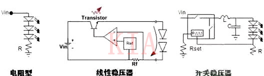采用DC-DC電源的LED照明應(yīng)用中,可以采用的LED驅(qū)動(dòng)方式有電阻型、線性穩(wěn)壓器及開關(guān)穩(wěn)壓器等。