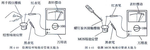 將萬用表置于“RX100”擋,兩表筆分別接漏極D和源極s,然后用F捏住柵極G(注入人體感應(yīng)電壓),表針應(yīng)向左或向右擺動(dòng),如圖4-40所示。表針擺動(dòng)幅度越大闡明場效應(yīng)管的放大才能越大。假如表針不動(dòng),闡明該管已壞。