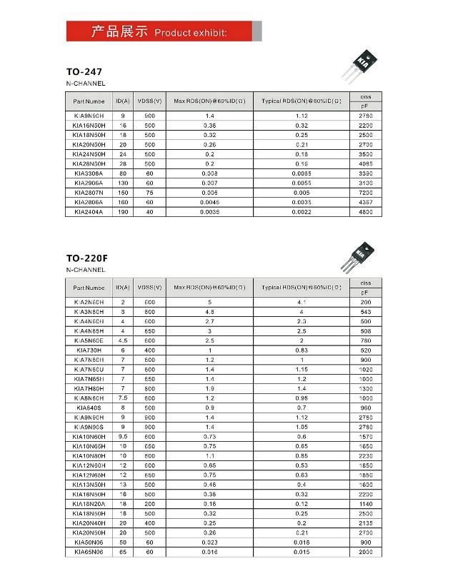 這過去的2007年,KIA一韓國技術(shù)研發(fā)人員為核心的設(shè)計團隊,成功完成最新型工藝為代表MOSFET產(chǎn)品的設(shè)計和生產(chǎn)定型,大幅度降低了產(chǎn)品的RDS(ON),提高客戶產(chǎn)品的轉(zhuǎn)換效率,并率先將該類型產(chǎn)品在中國市場推出,產(chǎn)品的相關(guān)測試數(shù)據(jù)均達(dá)到歐美同類產(chǎn)品,同樣這高溫可靠性和穩(wěn)定性方面表現(xiàn)優(yōu)秀。KIA半導(dǎo)體持續(xù)改進,永不止步期待與您一起努力向市場提供,更高性價比產(chǎn)品,共同提升核心競爭力。
