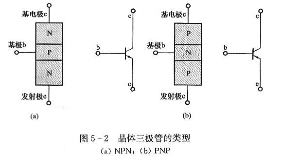 晶體三極管是一種具有兩個(gè)PN結(jié)(集電結(jié)、發(fā)射結(jié))、三個(gè)電極(發(fā)射極、基極、集電極)、三個(gè)區(qū)(發(fā)射區(qū)、基區(qū)、集電區(qū))的半導(dǎo)體器件。按所用半導(dǎo)體材料的不同可分為鍺管和硅管;按截止頻率可分為超高頻管、高頻管(≥3MHz)和低頻管(<3MHz);按耗散功率可分為小功率管(<1W)和大功率管(≥1W);按用途可分為低頻放大管、高頻放大管、開(kāi)關(guān)管、低噪聲管、高反壓管、復(fù)合管等,按PN結(jié)的構(gòu)成不同有NPN、PNP兩種類型,如圖5-2所示。