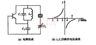 由圖(b)所示的L1C1諧振回路電抗特性曲線可知,對于5次泛音頻率5 MHz,L1C1回路呈容性,電路滿足三點式振蕩條件,可以振蕩。