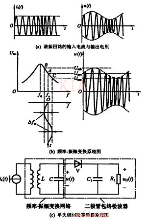以斜率鑒頻器為例,如圖所示,圖(a)是諧振回路的輸入電流與輸出電壓。圖(b)是其中的頻率一振幅變換原理。圖(c)為單失諧回路鑒頻器原理圖。