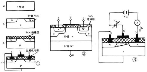圖1是典型平面N溝道增強(qiáng)型MOSFET的剖面圖。它用一塊P型硅半導(dǎo)體材料作襯底(圖la),在其面上擴(kuò)散了兩個(gè)N型區(qū)(圖lb),再在上面覆蓋一層二氧化硅(SiQ2)絕緣層(圖lc),最后在N區(qū)上方用腐蝕的方法做成兩個(gè)孔,用金屬化的方法分別在絕緣層上及兩個(gè)孔內(nèi)做成三個(gè)電極:G(柵極)、S(源極)及D(漏極),如圖1d所示。