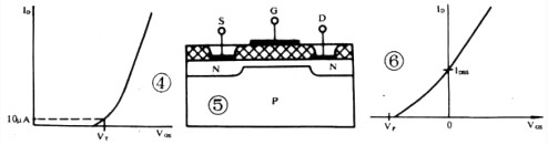 由于這種結(jié)構(gòu)在VGS=0時(shí),ID=0,稱這種MOSFET為增強(qiáng)型。另一類MOSFET,在VGS=0時(shí)也有一定的ID(稱為IDSS),這種MOSFET稱為耗盡型。它的結(jié)構(gòu)如圖5所示,它的轉(zhuǎn)移特性如圖6所示。VP為夾斷電壓(ID=0)。