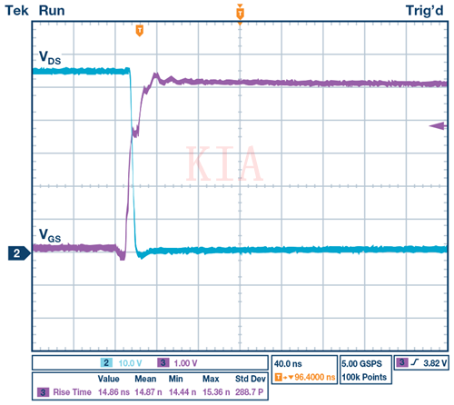 微控制器I/O引腳的拉電流和灌電流額定值通??蛇_數(shù)十毫安,而柵極驅(qū)動器可以提供高得多的電流。圖2中,當(dāng)功率MOSFET由微控制器I/O引腳以最大額定拉電流驅(qū)動時,觀察到切換時間間隔較長。