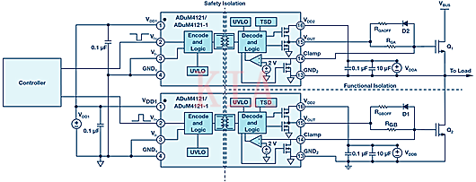 圖6.采用ADuM4121隔離式柵極驅(qū)動器的半橋設(shè)置中的隔離柵