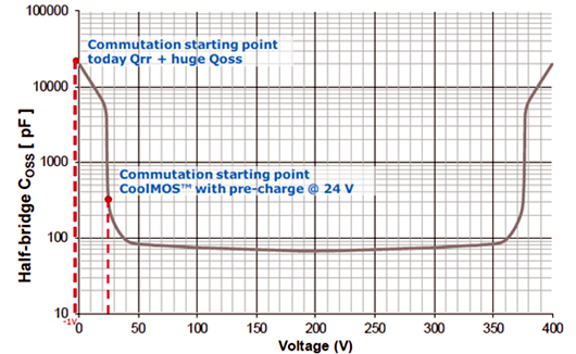 通過(guò)加入的預(yù)充電電路,在二極管模式下工作的MOSFET便可以在通道開(kāi)啟前預(yù)充至特定的電壓,例如24V。 如此便可大幅的降低 Qoss及Qrr相關(guān)的損耗。 因此可以大幅提高CoolMOS在CCM Totem Pole PFC的整體性能。