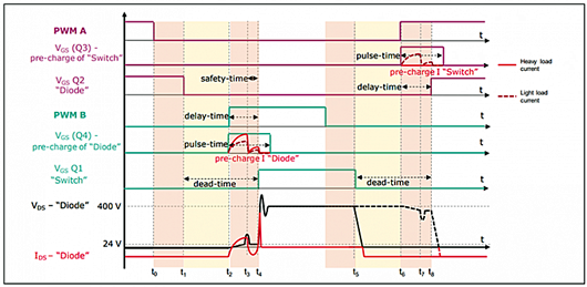 從圖四可以看出,在Q1或Q2開(kāi)啟時(shí),預(yù)充電的Q4 或Q3都尚未關(guān)閉,如此為保證Q1或Q2開(kāi)啟瞬間的低損耗。如果此脈沖過(guò)短,則Q2在開(kāi)啟瞬間發(fā)生硬換向的可能性很高。 如果其在多個(gè)連續(xù)事件期間發(fā)生,則會(huì)產(chǎn)生破壞性的結(jié)果。