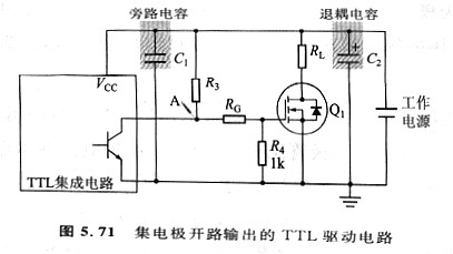 采用TTL集成電路驅(qū)動MOS另一個需求留意的問題是,工作電壓至少要高于VMOS的開啟電壓VGS(th),而且要保證圖中A點(diǎn)的驅(qū)動電壓高于開啟電壓。用CMOS來驅(qū)動根本上不需求思索這樣的問題,由于此類Ic能夠提供12V左右的信號電平(圖5.72)。