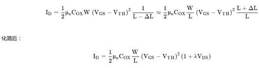 當(dāng)MOS管進(jìn)入飽和區(qū)后,輸出電流并不是水平線,而是存在一定的傾斜。這是由于導(dǎo)電溝道產(chǎn)生夾斷,有效溝道長度變短。