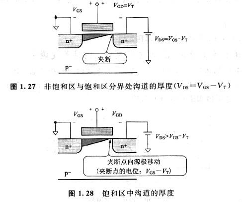 假如繼續(xù)增加漏極-源極間電壓VDS,以致于VDS=VGS-VT,這時(shí)的工作區(qū)域相當(dāng)于非飽和區(qū)與飽和區(qū)的分界處。由于柵極—漏極間電壓VGD=VGS-VDS=VT,所以柵極-漏極間電壓就與閾值電壓VT相等。就是說(shuō),如圖1. 27所示,漏區(qū)左近的溝道簡(jiǎn)直消逝了,把溝道消逝的狀態(tài)稱為夾斷。