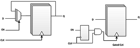 時(shí)鐘門(mén)控技術(shù)不影響設(shè)計(jì)電路的功能,也無(wú)須修改RTL(Register Transfer Level)代碼,它在設(shè)計(jì)和實(shí)現(xiàn)上可以是對(duì)設(shè)計(jì)者透明的,而電源門(mén)控技術(shù)影響各模塊之間的相互連接,安全進(jìn)入和退出電源門(mén)控模式會(huì)增加很多額外的操作。