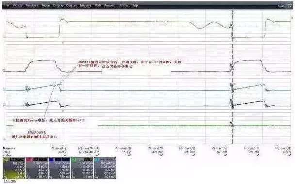 從圖中可以看出,電流波形在快到電流尖峰時,有個下跌,這個下跌點后又有一段的上升時間,這段時間其本質(zhì)就是IC在檢測到過流信號執(zhí)行關(guān)斷后,MOSFET本身也開始執(zhí)行關(guān)斷,但是由于器件本身的關(guān)斷延遲,因此電流會有個二次上升平臺,如果二次上升平臺過大,那么在變壓器余量設(shè)計不足時,就極有可能產(chǎn)生磁飽和的一個電流沖擊或者電流超器件規(guī)格的一個失效。