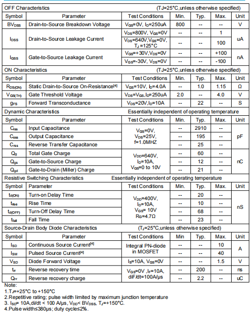 MOS場效應(yīng)管6180參數(shù):Vgs(±V):30;VTH(V):2-4;ID(A):10A;BVdss(V):800V;RDS (on) = 0.72mΩ(typ)@V GS =10V。具有低電荷,低反向傳輸電容,開關(guān)速度快等優(yōu)點(diǎn)。主要封裝形式是TO-220/TO-220F,腳位排列位GDS。