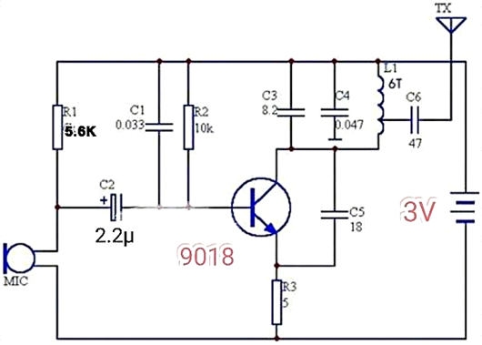 上圖所示的調(diào)頻無線話筒可以將駐極體話筒輸出的音頻信號(hào)轉(zhuǎn)換成88~108MHz的調(diào)頻信號(hào)并被調(diào)頻收音機(jī)接收。MIC為駐極體話筒,其輸出的音頻信號(hào)經(jīng)電容C2耦合至9018的基極,直接對其構(gòu)成的高頻振蕩器進(jìn)行頻率調(diào)制。線圈L1和C3組成并聯(lián)諧振回路,決定著電路的振蕩頻率,改變C3的容量或調(diào)整L1的匝間間距即可改變振蕩頻率。調(diào)制后的振蕩信號(hào)通過C6耦合至天線并向外發(fā)射。