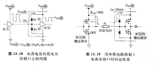 在接納IC的電源電壓比發(fā)送lC的電源電壓低的場所,如圖13.18所示,經(jīng)過IC②的輸入維護電路產(chǎn)牛的穩(wěn)定電流IIH會導(dǎo)致器件劣化,所以不能夠直接中止接口。針對這個問題,如圖13. 19所示,采用給信號線插入串聯(lián)電阻,抑止電流IIH的方法。