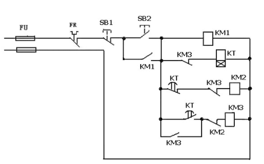 啟動時按下啟動按鈕SB2,交流接觸器KM線圈回路通電吸合并通過自己的輔助常開觸點自鎖,其主觸頭閉合接通電動機三相電源,時間繼電器KT1線圈也通電吸合并開始計時,交流接觸器KM3線圈通過時間繼電器的延時斷開接點通電吸合,KM3的主觸頭閉合將電動機的尾端連接,電動機定子繞組成Y形連接,