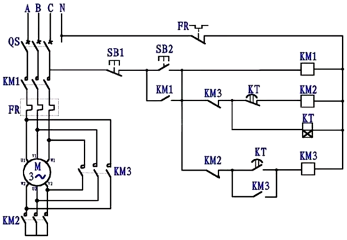 同時時間繼電器K1的延時閉合觸點閉合,接通KM線圈回路,使得KM2通電吸合并通過自己的輔助常開觸點自鎖,KM2主觸頭閉合將定子繞組接成三角形,電動機在△形接法下運行。