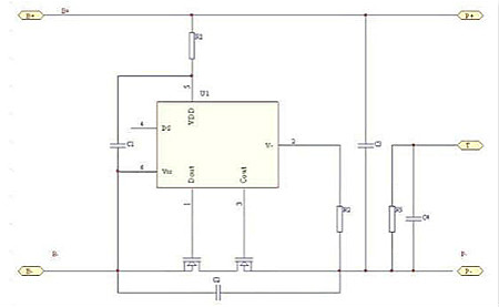 保護板有兩個核心部件:一塊保護IC,它是由精確的比較器來獲得可靠的保護參數(shù);另外是MOSFET串在主充放電回路中擔當高速開關,執(zhí)行保護動作。電路原理圖如下: