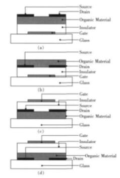 圖1(c),(d)為頂柵結(jié)構(gòu),即首先在襯底上制作有機半導(dǎo)體層,然后制作源、漏電極,隨后再制作絕緣層,最后在絕緣層上面制作柵極。這兩種柵極位于最頂部的頂柵結(jié)構(gòu)在文獻(xiàn)報道中并不是很多。