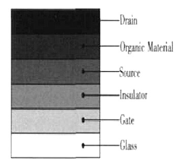 圖2是垂直溝道OFET結(jié)構(gòu),是以縮短溝道長度為目的的一類新型場效應(yīng)晶體管。它以半導(dǎo)體層為溝道長度,依次蒸鍍漏-源-珊電極,通過改變柵電壓來控制源、漏電極的電流變化。