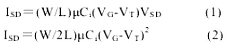 其中,Vr是閾值電壓,Ci是絕緣層單位面積的電容,u是載流子遷移率。當(dāng)Va大于閾值電壓且固定在某-一數(shù)值時,Vsp很?。▅Vspl《|VG-VT),此時,導(dǎo)電溝道中的電荷密度是線性減少,有機場效應(yīng)晶體管處于線性工作區(qū),漏電流可以通過方程式