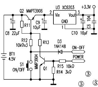1.初始狀態(tài):電路初始狀態(tài)下,開關(guān)S1沒有被按下,三極管Q2的基極為高電平,處于截止?fàn)顟B(tài),電源轉(zhuǎn)換芯片6203沒有電源輸入,也就沒有3.3V的電源輸出。三極管Q1也處于截止?fàn)顟B(tài)。