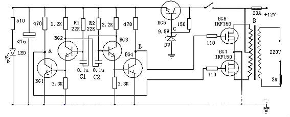 這是一款非常容易制作的逆變器,可以將12V電源電壓變?yōu)?20V市電,電路由BG2和BG3組成的多諧振蕩器推動(dòng),再通過BG1和BG2驅(qū)動(dòng),來控制BG6和BG7工作。