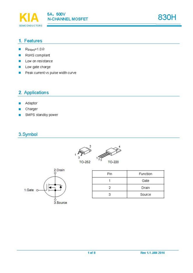 參數(shù): ID(A): 5    BVDSS(V): 500    RDS(ON): 1.2    Qg(nC): 20    Package: TO-220、TO-252