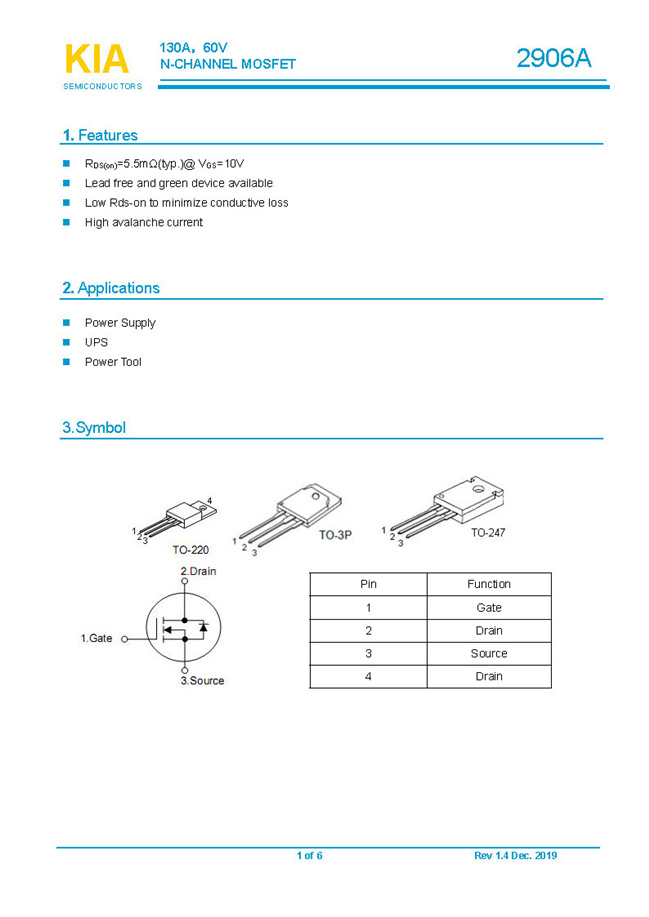 參數(shù): ID(A): 130 BVDSS(V): 60 RDS(ON): 5.5mΩ Qg(nC): 66.34 Package: TO-220.TO-3P.TO-247