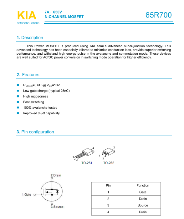 參數(shù): ID(A): 7 BVDSS(V): 650 RDS(ON): 0.6 Qg(nC): 8 Package: TO-251、252、220F