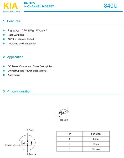 參數(shù): ID(A): 8 BVDSS(V): 500 RDS(ON): 0.9 Qg(nC): 17.8 Package: TO-252