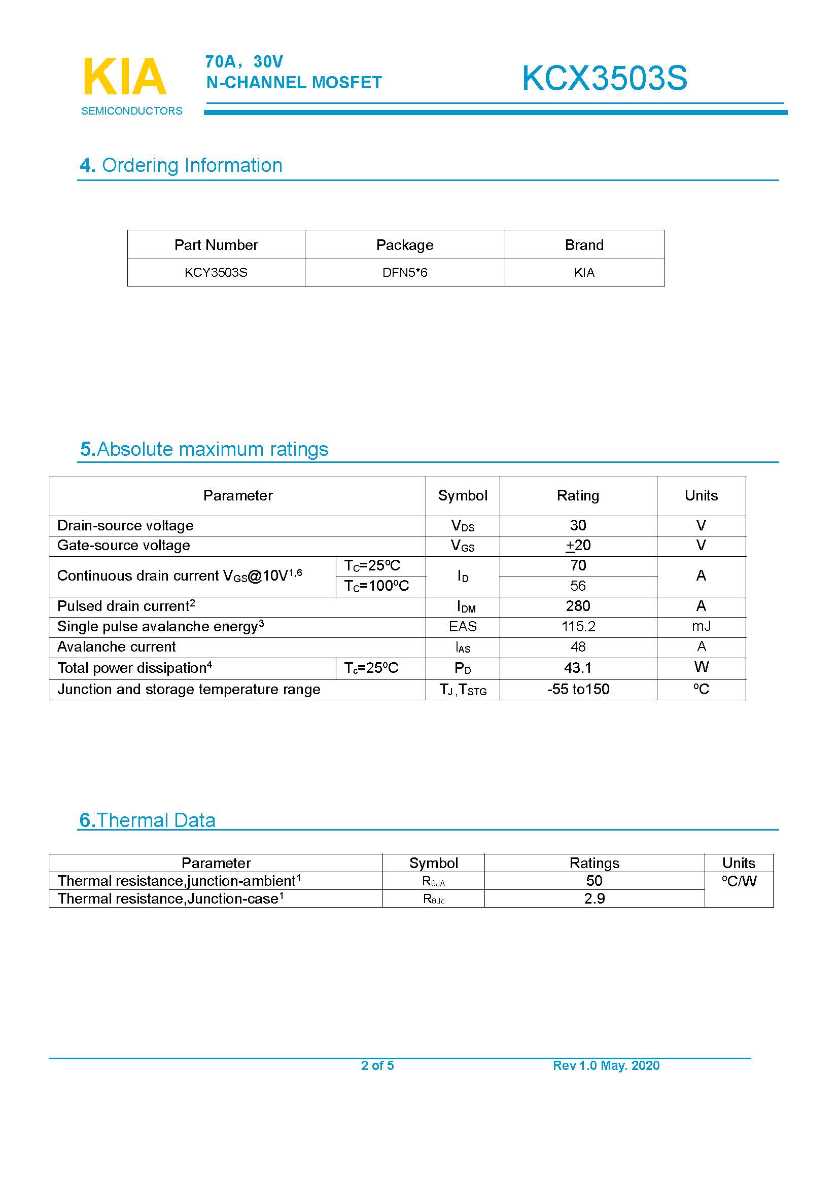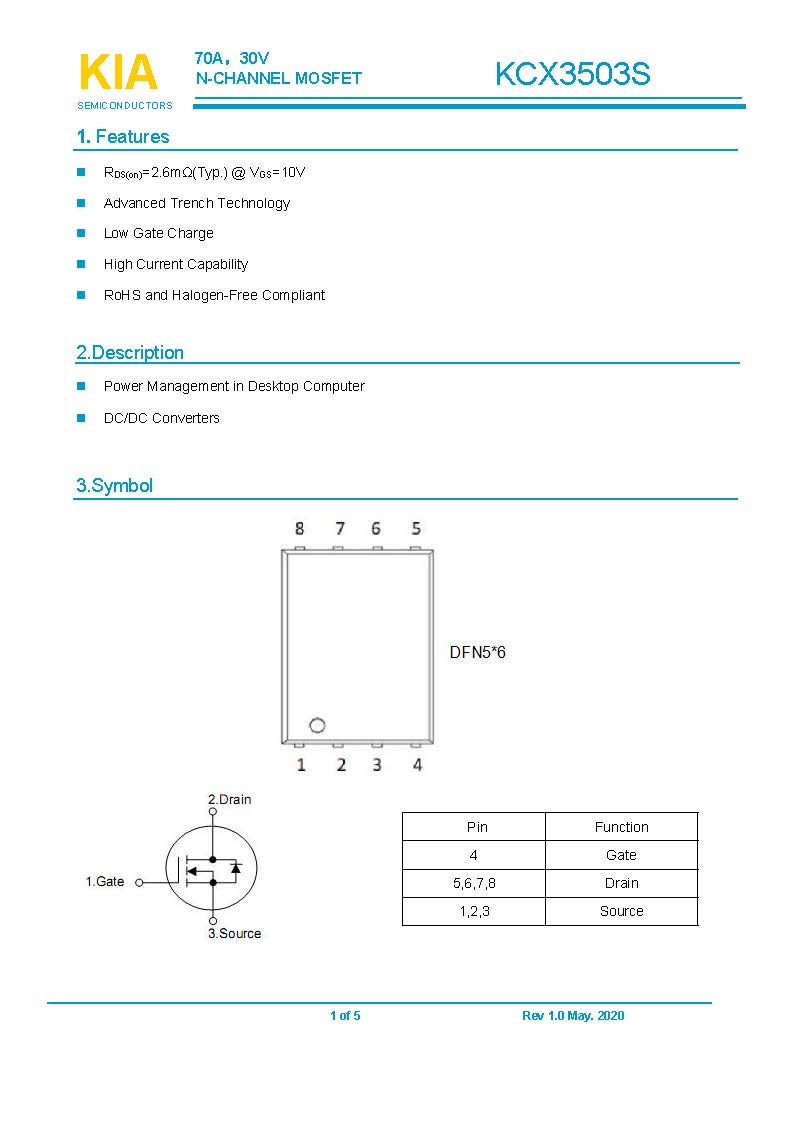 參數: ID(A): 70 BVDSS(V): 30 RDS(ON): 2.6 Qg(nC): 20 Package: DFN5*6